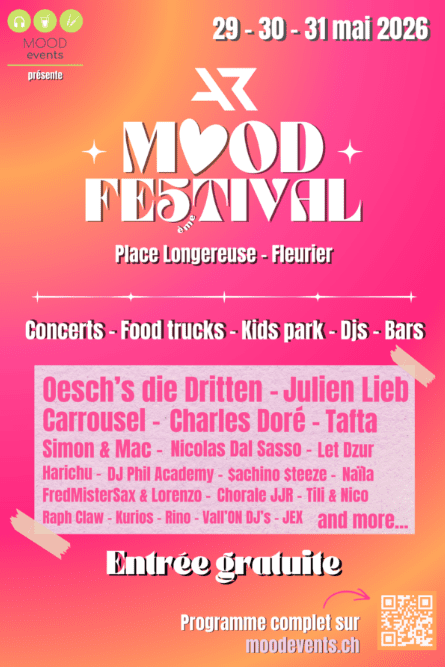 Das AR Mood Festival kehrt für seine 5ᵉ Ausgabe am 29., 30. und 31. Mai 2026 auf den Place de Longereuse in Fleurier zurück. Drei Tage lang kann das Publikum eine gesellige Atmosphäre mit 17 Foodtrucks, Live-Konzerten, DJs sowie Bars und Cocktails genießen, bei denen lokale Produkte im Vordergrund stehen.