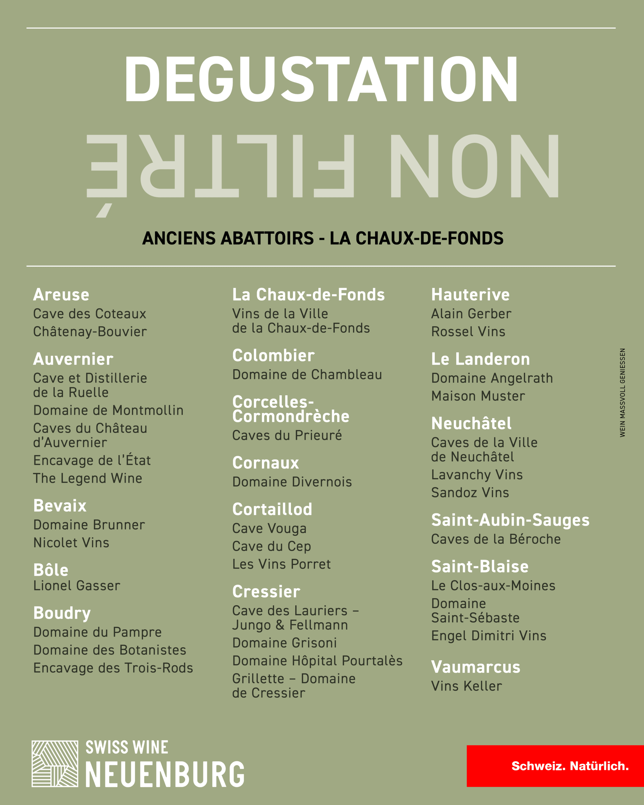 Dieser typische Neuenburger Wein wird aus Chasselas hergestellt. Wenn er Anfang Januar ungefiltert in Flaschen abgefüllt wird, ist seine Gärung bereits vollständig abgeschlossen. Der Neuenburger Non Filtré ist der erste Wein des Jahres und stellt somit einen Vorgeschmack auf den neuen Jahrgang dar, der im Herbst zuvor geerntet wurde.